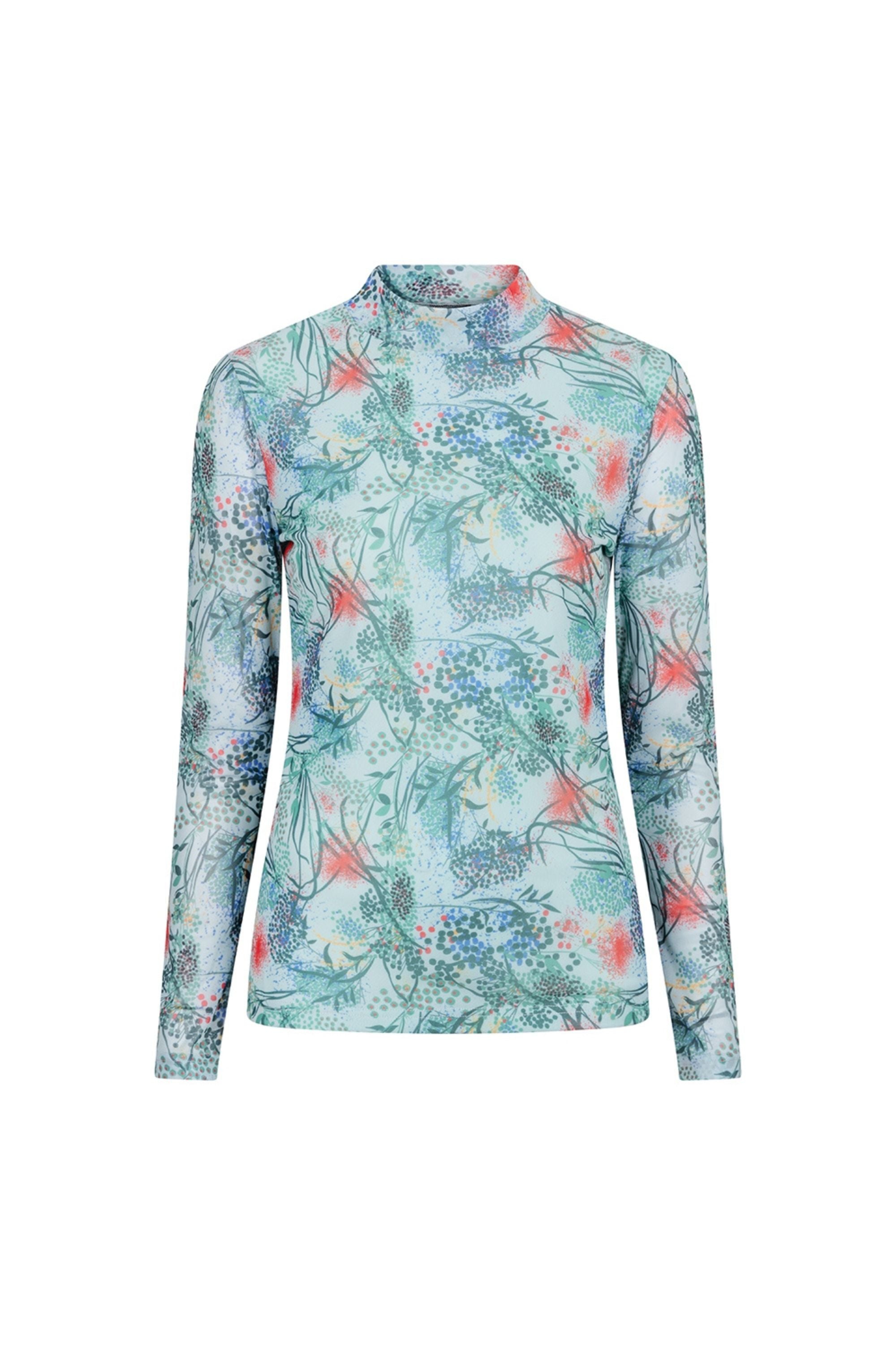Mesh top Mia, an absolute must-have for the fashionable woman during summer days. This top offers ultimate airiness and style in one. The semi-transparent fabric of the mesh top Mia features a colorful print that immediately attracts attention. With a light lining, this top is both trendy and comfortable to wear. The long sleeves and high round neck add a touch of elegance to the design. Made of a wonderful stretch quality, the top adapts perfectly to your body. The colorful print in soft shades of green provides a playful and summery look. Combine this airy top with high-waisted jeans, a skirt or shorts for an effortlessly trendy outfit. Wear it to the beach during the day or dress it up for a night out.